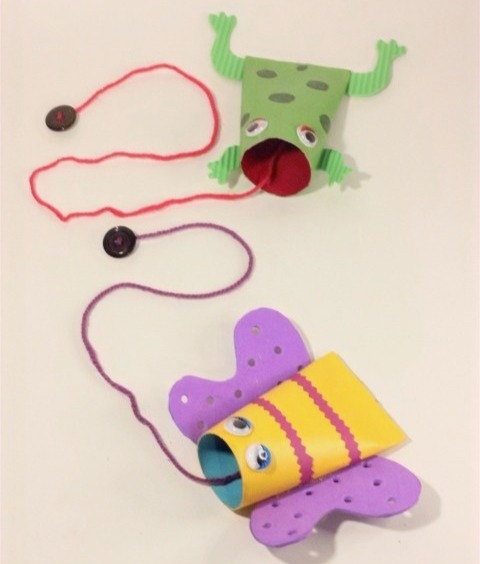 Decorate your paper roll and add any fancy embellishments you'd like. I thought the frog was a cute idea, as the string represented its tongue, and the button was the fly that it wanted to catch and eat.